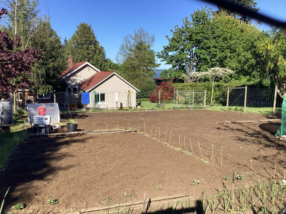 Rototilled the pumpkin patch and vegetable garden today. Was super easy because the soil is bone dry and I pre-mowed the rye grass down so low that the tines had easy work of the rest of it. Andrea followed up by raking out any uneven spots and making sure it look all even. We've stock piled compost, peat moss and Promix HP for vine covering and root node burying.