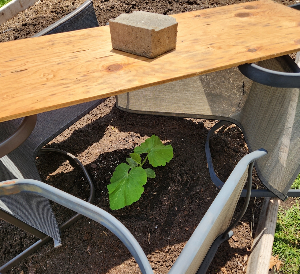 Outside temps hit 82 Fahrenheit in my backyard today. To help protect the pumpkin I rigged up a makeshift concoction of lawn chairs, plywood, and concrete edging blocks to help reduce stress on the pumpkin as it hardens of with wind and shade protection.