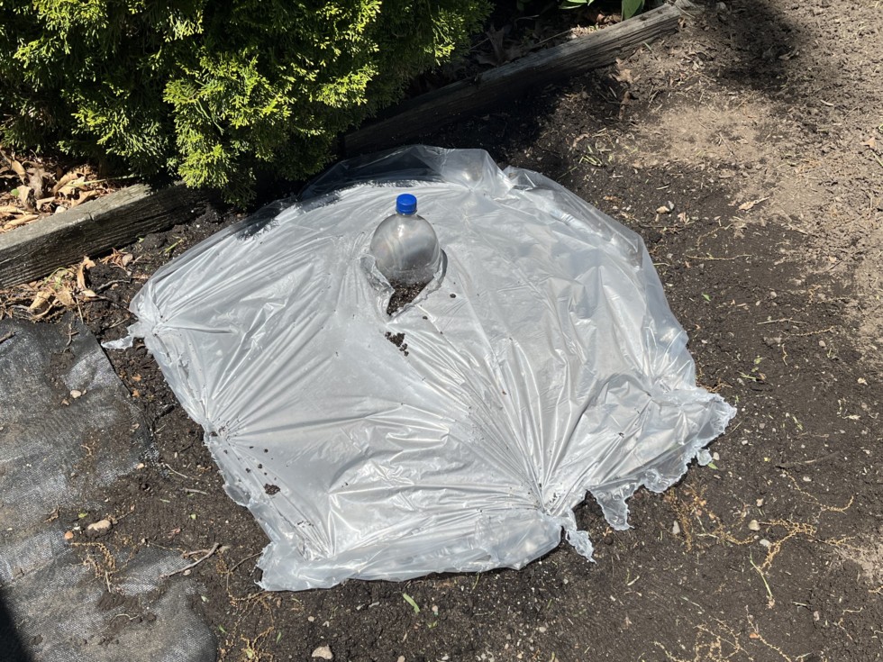 I direct seeded two DeMarco 266 seeds into this mound of potting soil that I added organics to. One of the seeds germinated late indoors so I added another fresh seed. Hopefully the .7ml clear plastic and a cut Polar Seltzer bottle will heat up the soil.