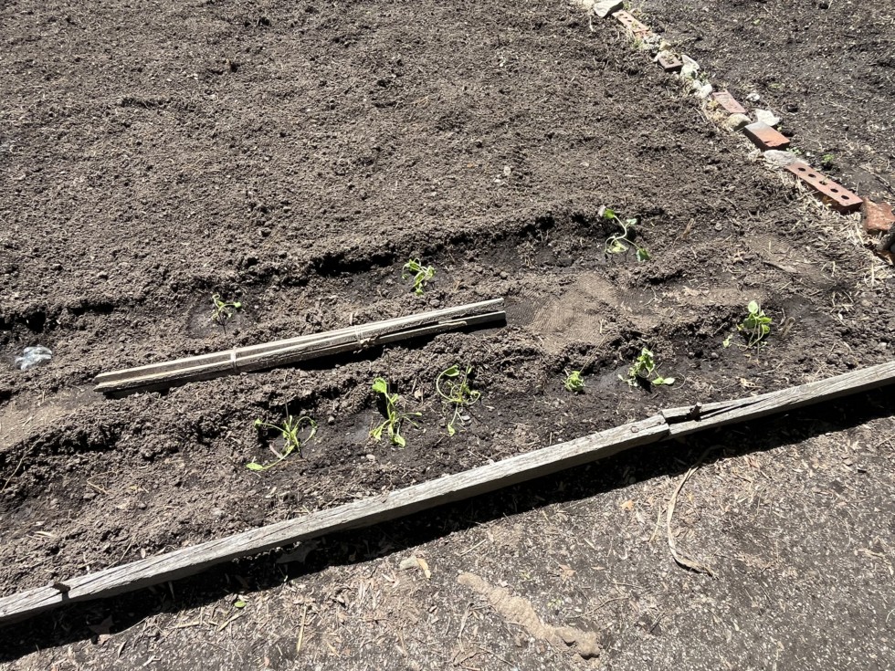 The greens are weak, despite a lot of hardening off. The tomato seedlings really overgrew them in the trays. I added some skewer stakes for support, they work great for small seedlings.