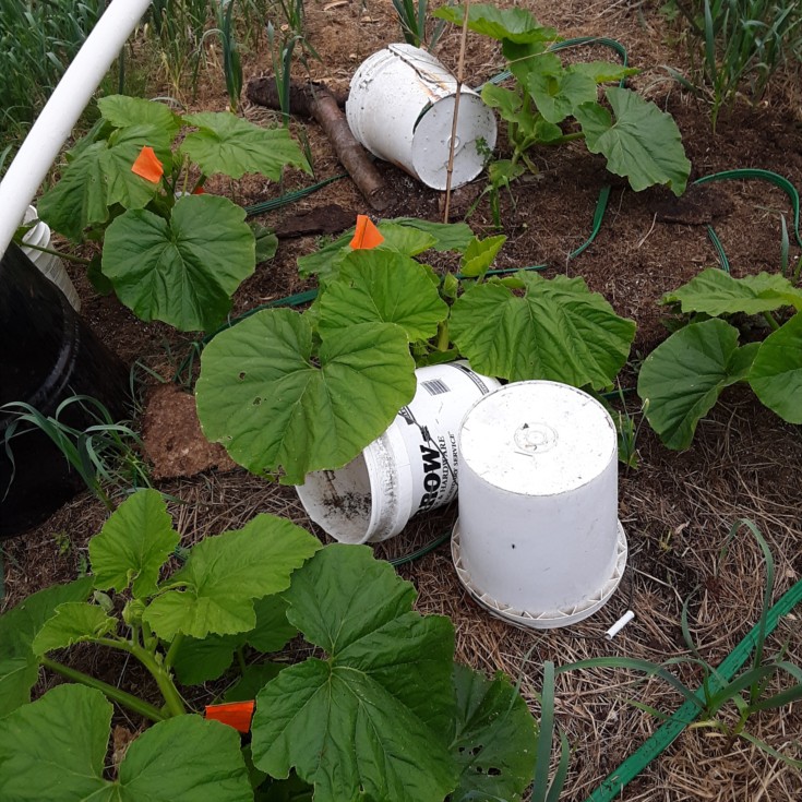 The direct seeded squash genetics plants are nice & big (plenty of potassium and nitrogen) I can already tell the one in middle is going to be a pumpkin. So just 3 that could still be squashes. The 2054 Strickler (top) has improved. There's no easy choice here, and I will probably let all of these get very crowded rather than make the wrong choice.