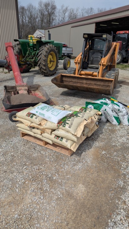 Soil results showed a need for calcium more than anything else. Here I am blending some gypsum, pel lime, alfalfa pellets and granular boron as I load the spreader.
