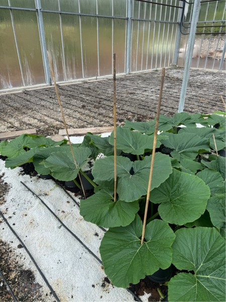 We're already putting in the 5ft bamboo canes. We just push them through the ribs of the leaves and it keeps them all nice, upright and neat.