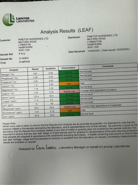 However if you take a leaf sample after the pumpkins are about the size of a beach ball the calcium will always be low and there's little that you can do about it. At this point all the calcium is transporting water to the pumpkins and the leaves don't get a look in.