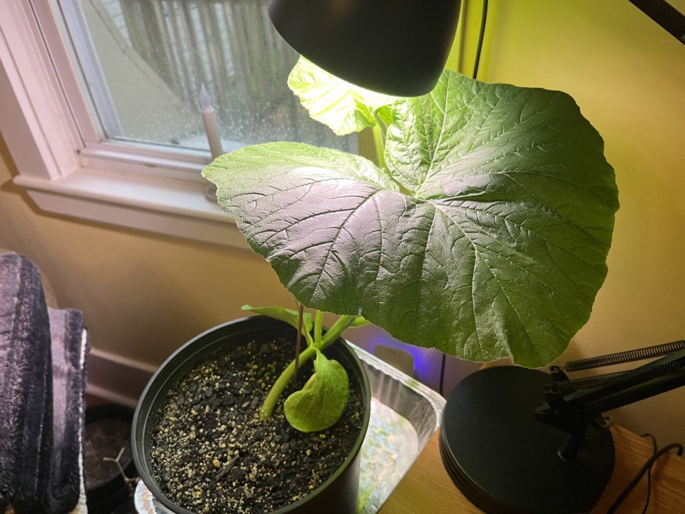 48 degrees with a Nor'easter. The plant will be going outside sometime after Memorial Day. I will carefully work the main down when it warms up.