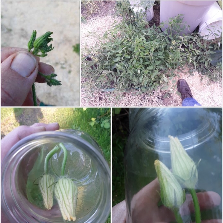 One last post for today. Clockwise, the overwintered 9.5/8.68 clones have made a big healthy plant. These two males will be kept in refrigeration for 24 hours to align them with the female on the 1448 Bongers. Not sure if this will work. There's one male on the plant that should be aligned. She's gonna bloom May 26th, in 36 hrs I think... last pic is a blossom (off the overwintered clones) that is kinda runty at first glance but I dissected it and it wasnt all that bad. I'm curious how big a tomato it could have grown. Well, won't know now!
