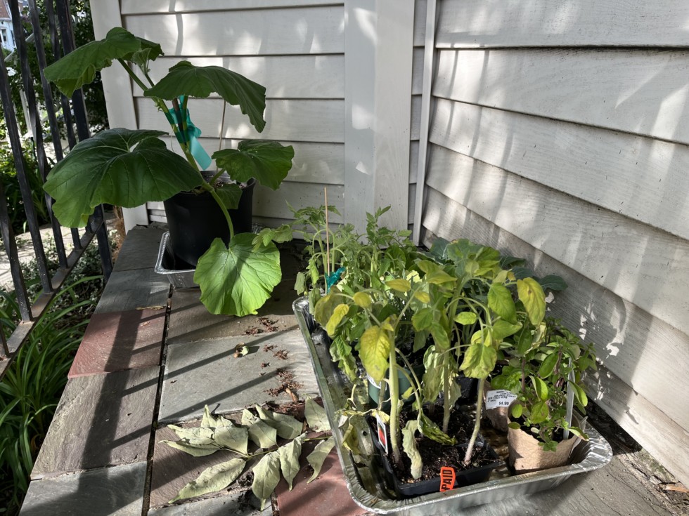 This morning I thought I snapped the pumpkin plant when I picked it up and it twisted. Fortunately it's okay.