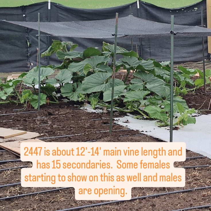Weather has sucked here. Sure most of us have had it. Been in the elements since May 10th so can't be to disappointed. Hopefully the new forecast stays true. Here is the 2447 which is the strongest plant. The 2560 is the second best looking and then the 2465. The pollination plants in 25 gallon pots are making there way down to the ground may see how big of a pumpkin we can get from a potted plant.