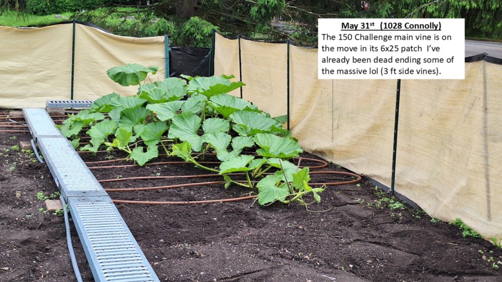 My 150 Challenge plant's main Vine is cranking. First pumpkin is showing but I'm sure I"ll be culling this one until the Main gets out to about 18-19 ft. Fingers crossed. Time to start increasing the ferts and biologicals.