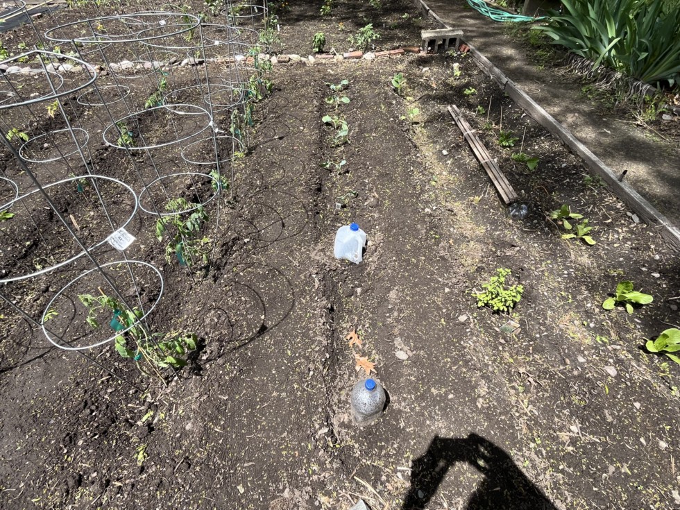 In the veggie garden we direct seeded Cool Customer OG and Gershwin F1 cucumbers under the plastic containers.