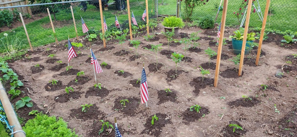 Garden coming along. Everything started from seeds back in February. 3 different varieties of tomatoes 6 different varieties of peppers,corn,cabbage,carrots,beets,parsnip and lots of herbs. Yellow watermelons and zucchini with squash growing elsewhere.