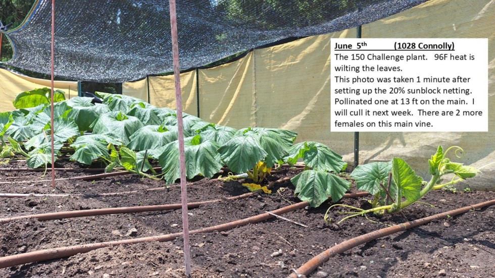 Maybe our 150 Challenge plant would of made it through todays 96F heat, but I decided to put up the 30% sunblock netting rather than take the risk of burnt leaves. The fencing fixed the problem in about 30 minutes. See 2nd photo. I got 3 pumpkins showing on the main. One was pollinated today at 13 ft. See resdults after 30 minutes on the next diary post.