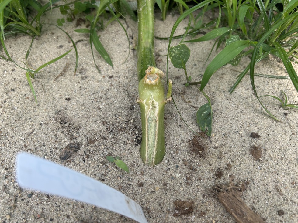 This is the only issue so far on that plant. A shallow split in the stump that is healing nicely. I would consider it a normal growth split and I'm not worried.