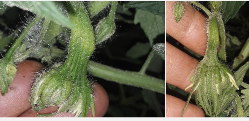 Ok, one more... 3.9 Leurs has some decent side blossoms. Its easy to see the five fused tomato stems in the blossom on the left. The blossom on the right is similar. There's a nutrient issue: a bit of yellowing/ lethargy in the stem. But nevertheless I'll see if I can get one or both of these to set. The plant is vigorous but they do need the right minerals to get going. Since I dont know the exact deficiency here, I might add a balanced slew of minerals. One possible reason for the lack of minerals in this spot might be competing tree or grape roots. The trees and grapes are doing amazing, and they're getting extra minerals from somewhere.