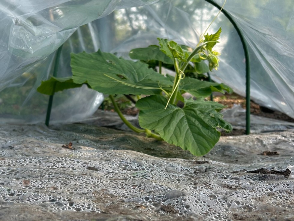 Looking a lot better now with the recent weather. I have to get in here in a day or two and add a slit to the plastic. The plant is starting to throw off bottom roots.