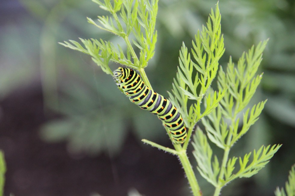 There is a guest on one of my carrot plants: a beautiful swallowtail caterpillar, nibbling on the greens (perhaps trying to nip off a few leaves to encourage root growth, who knows).