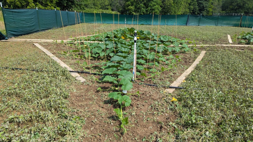 2021 Hoornstra. This plant is the smallest in the patch, the vines are long but kind of skinny and leaves are smaller than the others. I think this is the wettest spot in the patch so that is likely causing issues. I pollinated on this morning. 2021 Hoornstra x 2344 Wallace