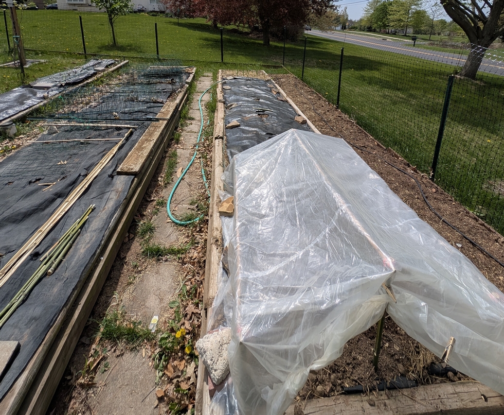 Planted the larger 656 Domke under the poly tent. Growing in a raised bed garden, about 500 square feet available between the two beds and additional soil area. Soil has had lots of compost over the years. Compost and horse manure added late winter this year. Mixed in high nitrogen fertilizer and about a pound of sulfur soil acidifier (based on results of Penn State Univ. soil test). Soil nice and loose about 1 foot deep.