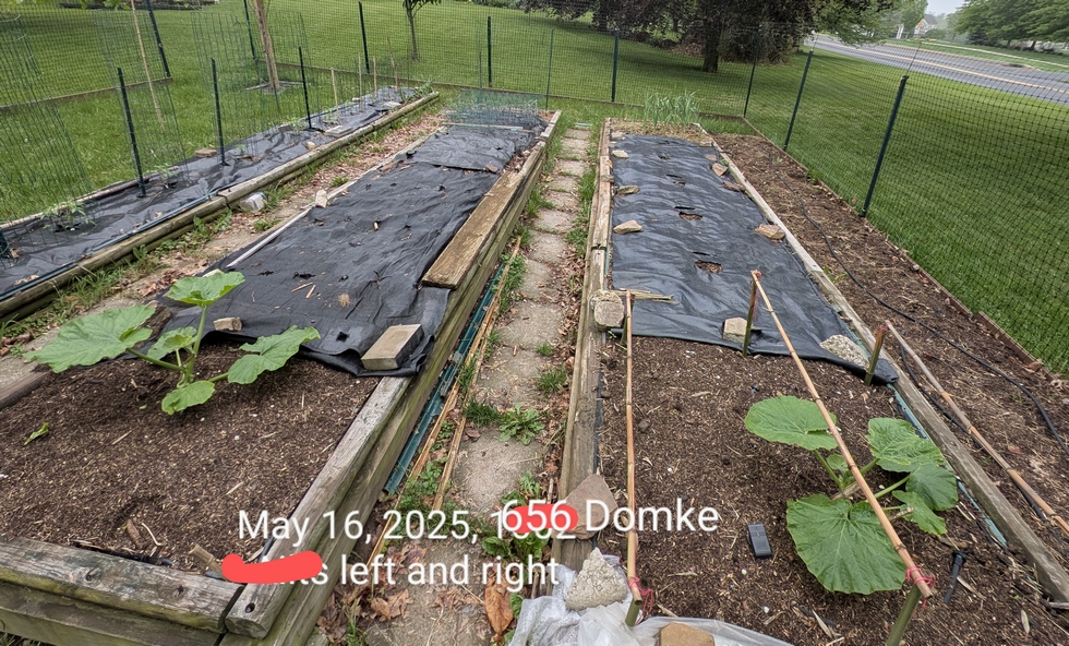 Two 656 Domke plants transplanted and growing nicely in spite of unusually cool, cloudy and rainy spring. Drip irrigation hose installed on right side bed, not in left side bed (which will probably become a secondary plant).