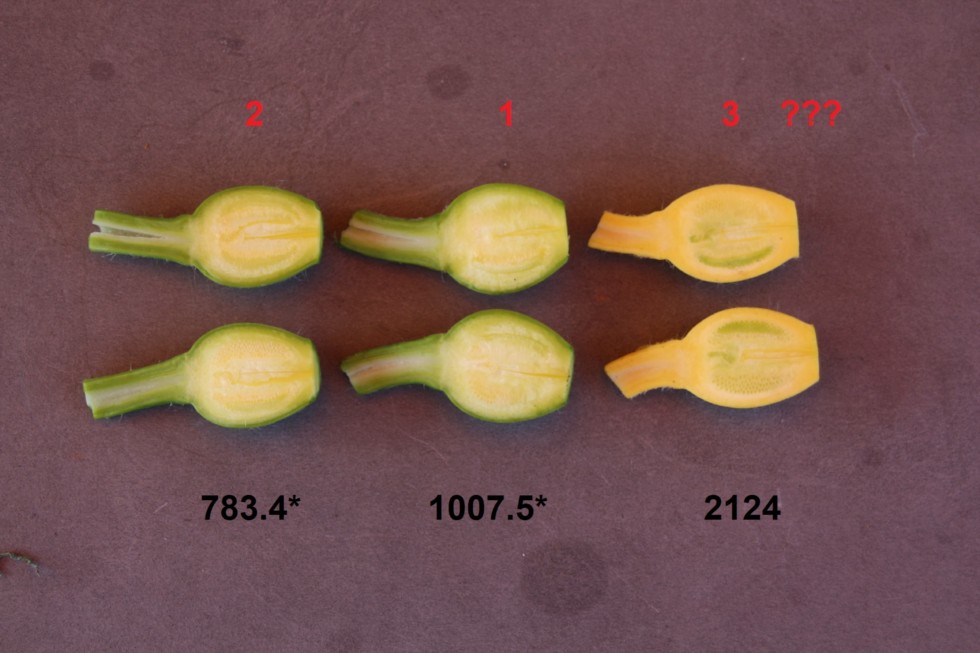 Today there were females open on the main vines of three plants, females that I didn't mean to use as keepers (want to wait for another week, let the plants grow a bit stronger first). One of them was on my kids' plant (they are growing the 783.4* Wagler 22 this year), and the other two on my 1007.5* Wagler 21 and 2124 Wuersching 24. Their size is similar, but their cross-sections reveal signs of different wall thicknes. Based on this observation (and normal fruit shape of the final keepers provided), I am inclined to make a prediction that my 1007.5* is most likely to go heavy (in a decent manner), the783.4* not so much, and the 2124...I will keep my fingers crossed that it will weigh to chart (at least).