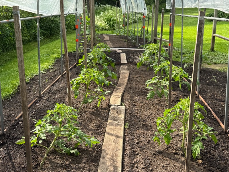 Tomato Alley is growing well and got a hair cut this week. Blossoms are starting to show on the first trusses but I am not seeing anything special yet. Plenty of time and our 7.95 Young tomato was about 5 feet up the plant.