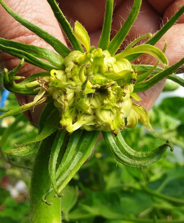 Here's a better pic of a big flower, I'm calling this a "sunflower" type mega. 5.16 Greene, plant 2. Its the fattest side shoot blossom I've ever gotten. Looks like a first truss blossom on a main vine... I thought this would abort but now it looks like its growing.