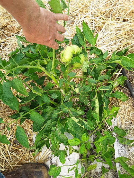 Small plant, but decent tomato. This was the most crowded spot earlier when they got transplanted here there were a dozen plants here, then five plants, then three plants, then two plants. And there are still two plants here, the other one is going the other direction. Long story short, this early crowding caused this plant to be one of the smallest plants.