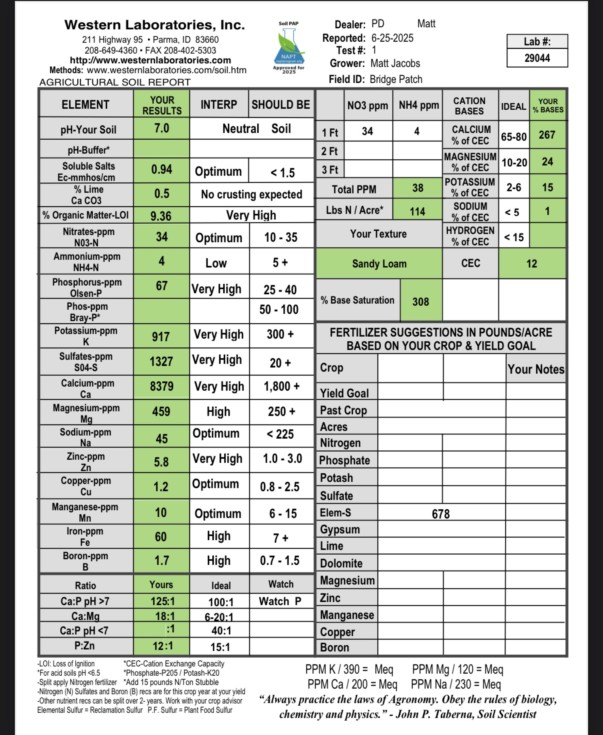 Soil Test. Need to find a way to get sulfur into plant, tissue test in next entry shows a deficiency despite off the chart value in soil test. I'll keep adding Boron and a little Copper through drip.