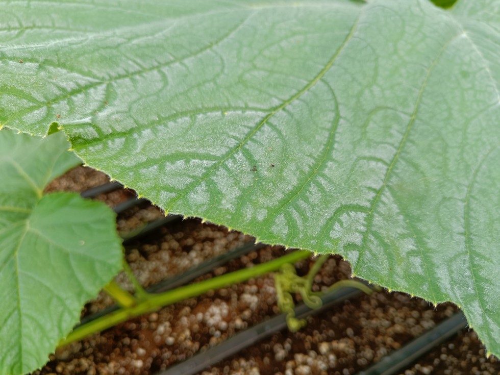 Limescale depostits on the leaf from the overhead misters, not good as it will inhibit photosynthesis. My fault I should have used hydrochloric instead of sulphuric acid, which I will do from now one. It'll make soluble calcium chloride instead of insoluble calcium sulphate; chloride is ok in small amounts but it's not good to let it build up so I will have to install an RO system sooner or later. You live and learn.