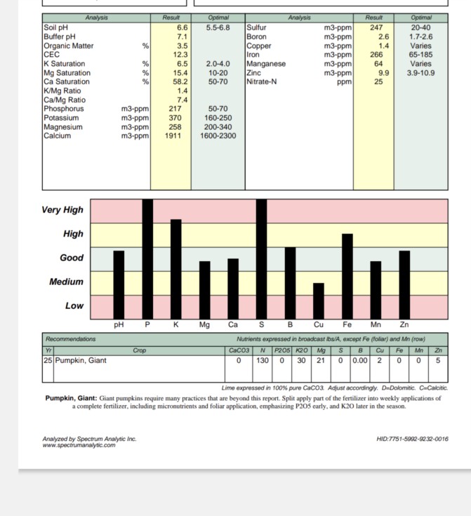 Got my latest soil sample results today. Not super excited about it. Boron is still low in spite of 1lb of borax per plant. Calcium is lower than my last sample, I'm guessing I have the gypsum worked in deeper now. And nitrogen is really low. The boron and nitrogen are a product of the crazy wet weather. I should have been more aggressive with the nitrogen, I was being cautious not to over apply. At least I feel like I'm learning a ton in my first year!