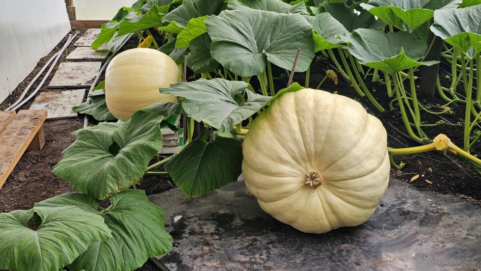DAP 20 2nd pollination on Barron 2144 #2. OTT ...a disappointing 127" but as you can see, the 1st pumpkin decided to stop growing. The final 1/4 of the stem was cut today and you can see the stem to the right, dusted with sulphur.