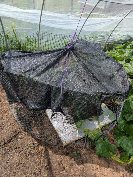 I have placed the pumpkins on boards and put up the chicken wire up with shade netting on top.
