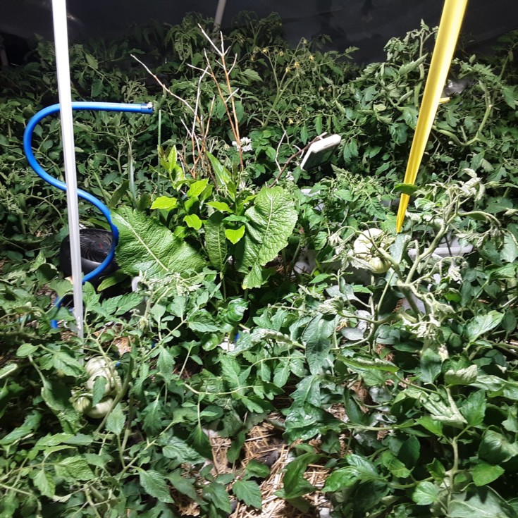Lemon tree popping up in the midst of the tomatoes. It overwintered outdoors. Barely. Really only a small twig at the base survived.