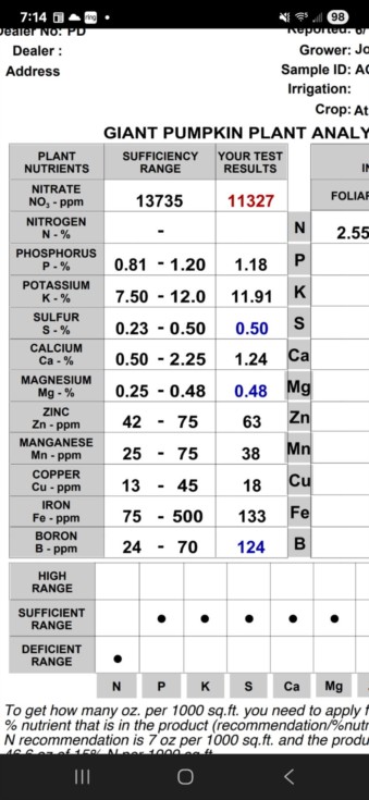 I learned another very valuable lesson this season. BE CAREFUL HOW MUCH BORN I ADD TO THE PATCH!! I was at 2.9 ppm last year end of season. Was hoping to get to 5.0 ppm this year. But obviously added way too much last November. The result - every pumpkin aborts on day 5, leaves all have yellow, curled up edges, burn easily with full sun, very fragile and horrible looking. Many of the male blooms have no stamen. Many of the female flowers are deformed when they open. Total disaster of a growing season.