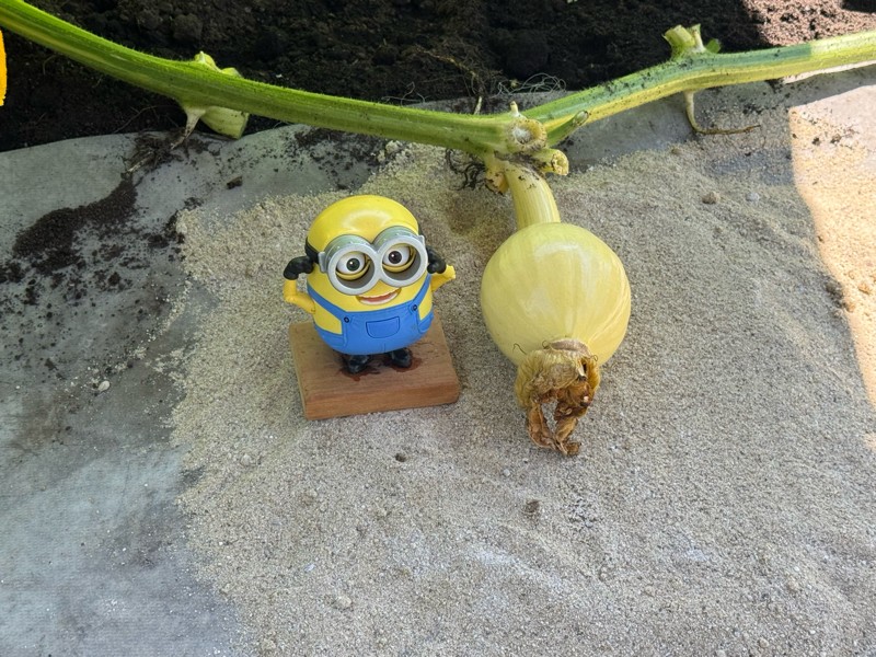 This is our model named Bob to be used to show scale as the pumpkins grow. This baby is the 839 Sandercock x self and is at 13.5 feet out from the stump. She was pollinated on June 27th.