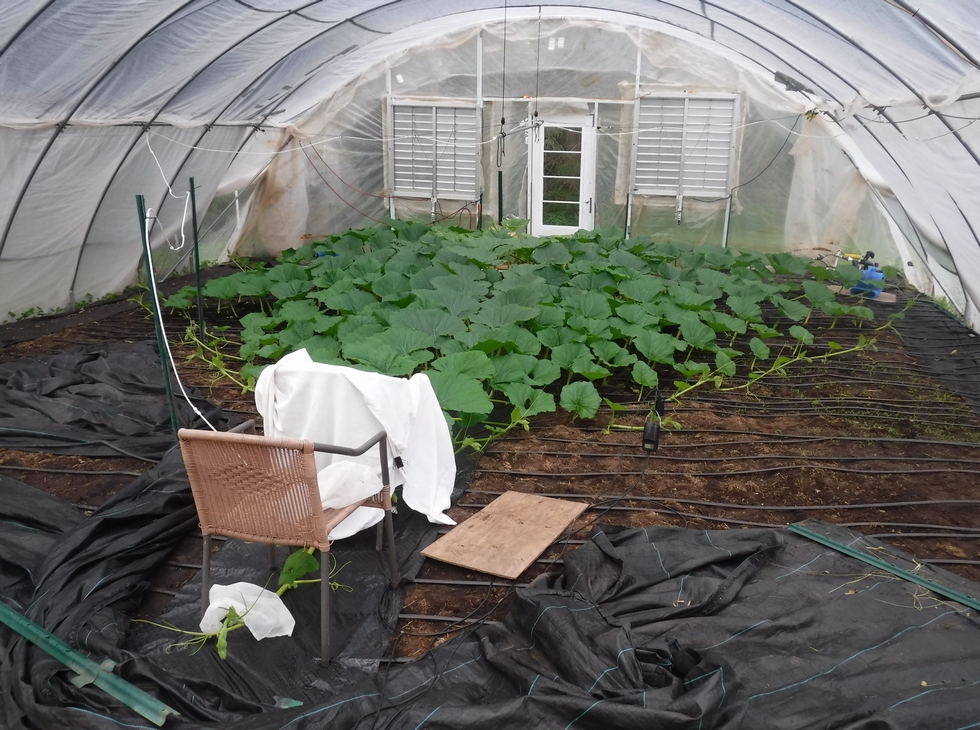 The intended keeper is under the chair with the white sheet over it. The back-up female flower is closer to the main vine growing tip and is under a 5-gallon paint strainer bag to provide some protection and shade.