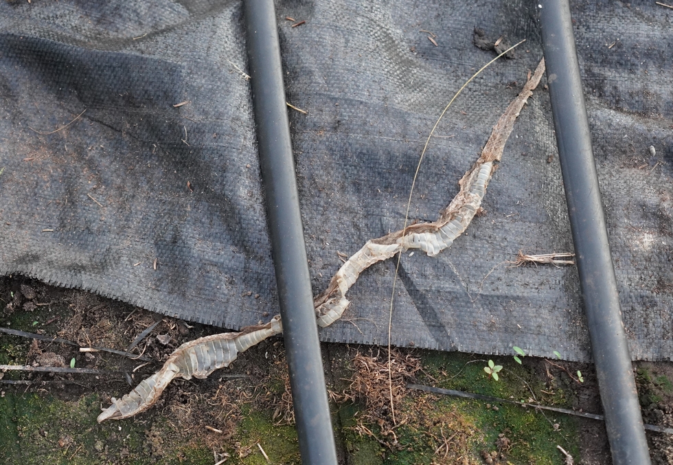 It seems every year early in the season the warmth of the hoop house structure attracts at least one snake. While he was not seen much this year, seeing the skin left behind indicates he is in the area and is actively growing. Always nice to have additional help in the patch with pest control.