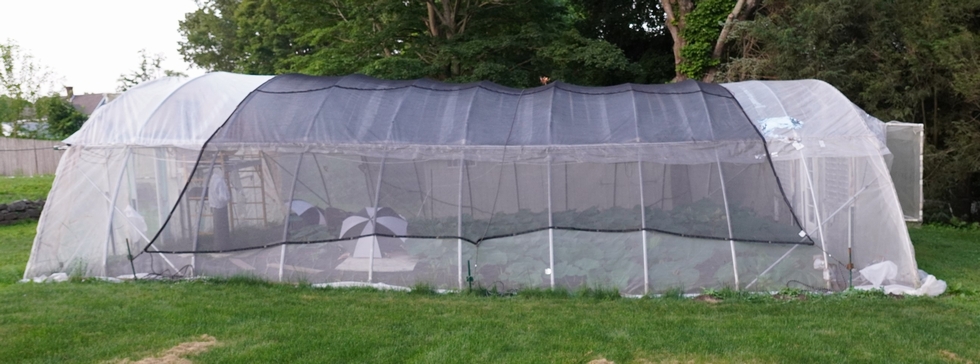 The side walls of the hoop house have been taken down, shade fabric is up and umbrellas are set around the pumpkin and main vine. The CO2 system has been temporarily shut down now that the sides are open because increased outside air circulation will be more important over the next few days.