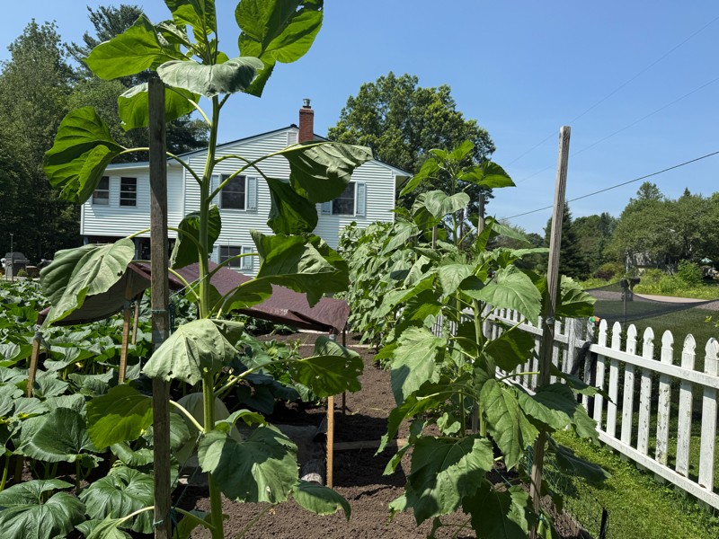 The sunflowers are starting to stretch out and the tallest is around 8.5 feet.