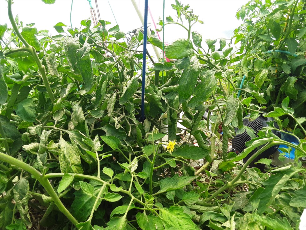 Lone blossom on the 9.5 with the big tomato on it. 9.5 x 5.16 Greene plant 2. Plenty of time to grow another tomato.