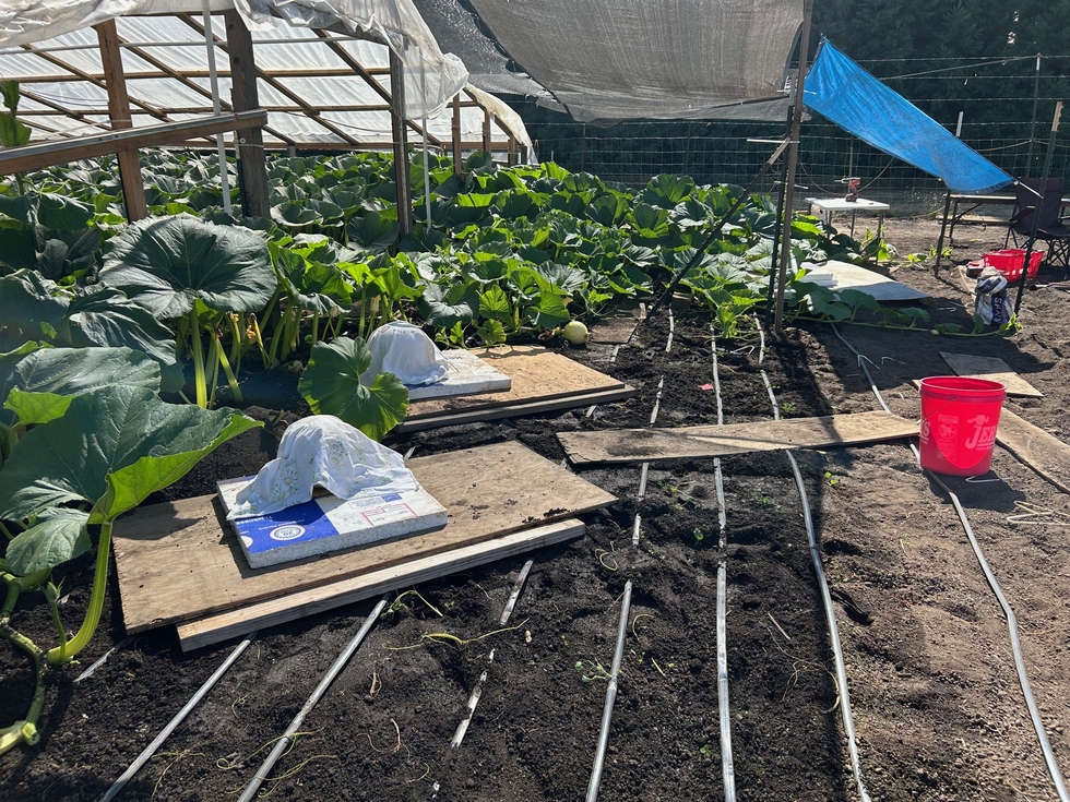 My 2069 Stelts fruit blossom end split about 3 weeks ago. Then I set a 8 more with the hopes that I might get lucky & have some of them that don't split. Over the years it seems like if you have one that gets a BES, then the next ones will too because they are genetically similar. The new ones were pollinated between July 9 and 13. Our Terminator contest is October 18th. These pumpkins could be 95-100 days old then. I will probably keep most of them on the vine until day 40 or so, because I think there is a high probability that they will all split. Here is the question: how many 700-900 pumpkins should I be able to grow on this fantastic 1200 square foot plant in this manner? I want to grow some paddlers for our club regatta. Please share your thoughts!
