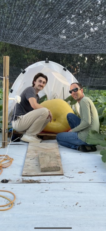 Matt and Jim stopped by to help me adjust my 2198 for the long haul. we got it more perpendicular to the main vine with a nice bend that the pumpkin can grow back into.