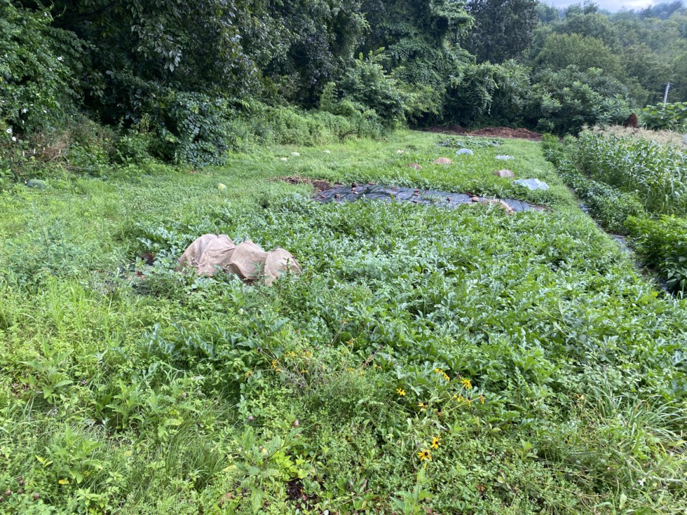 This is an overview of the entire patch. I have six Watermelon plants and one giant cantaloupe, which is dying. I had to remove one of my giant watermelon plants, which was my 232 Williams jumbo black diamond for some reason I couldn't get it to set fruit and keep them.