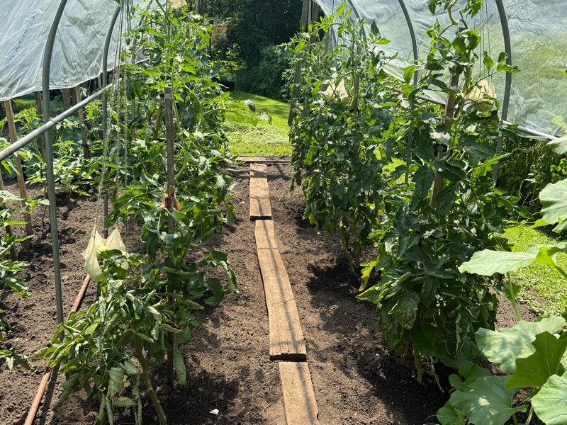The south tomato tunnel has all of its keepers selected. The biggest circumference in here is 21.75 inches but slowing down. Hopefully some of the younger pollinations will out grow it.