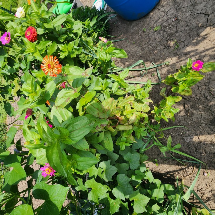 Beginning early blight treatment on my zinnias. Community gardening is a challenge with many gardeners letting weeds grow and grow.