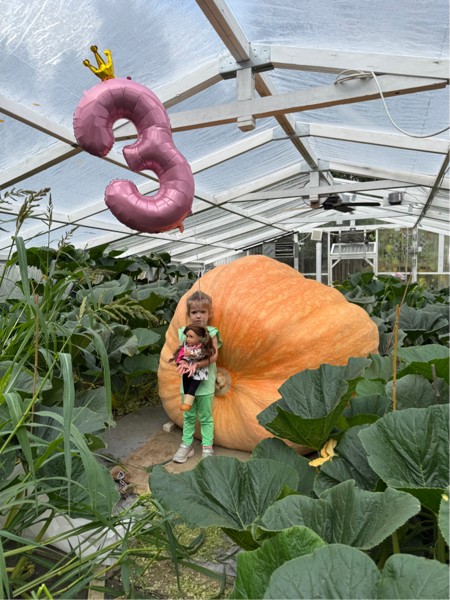 Grand daughter and birthday girl, in front of Jims 2551 Ford, only 14 days left to grow