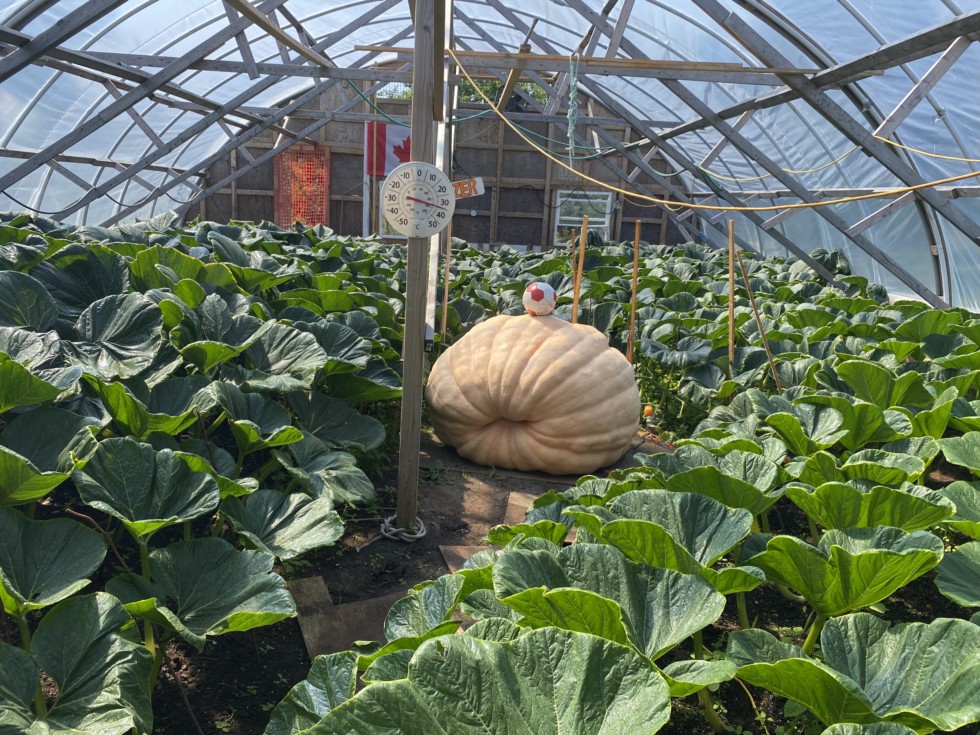 The Dilldozer sitting at 1200 lbs at day 50 . Hopefully I can squeeze out a new PB . Had to move it away from the plant a few times now and this one feels much heavier than pumpkins of the past .