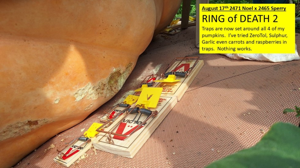 RING of DEATH 2 For the last 7 days, most of my pumpkins are slowly being eaten alive. I set 8 mouse traps and next day only one mouse trap remained. The wounds are trying to heal but everyday/night the critters come back and keep chewing out the same places plus new places. 1) I coated the knawed out areas with sulphur but they just eat the sulpher with the pumpkins. 2) I tried detering them with ZeroTol, but they just eat right through the evaporated hydrogen peroxide, 3) I tried Garlic on and around the damaged area's but they just eat the garlic. 4) I put carrots and raspberries in traps near the pumpkins, and you guessed it they ate them and the traps did not close. Now I'm going with a ring of death around every pumpkin. Hopefully I catch some of these varmints ( what ever they are ) tonight. Stay tuned. This is War.