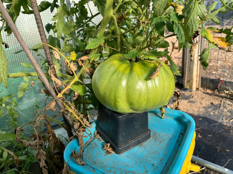 This is my best tomato so far. It comes from my own 4.08 from last year (which came from a 7.95 Young). It measures 22 inches in circumference and is still green.