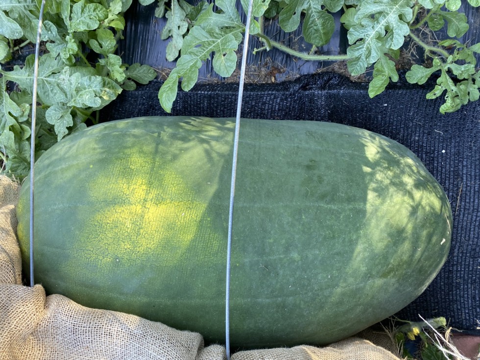 Meanwhile this past week two of my 198 Ciesielski Jumbo black diamond's got sunscald. It had a burlap shade tent over it. My guess is I let the melon get too close and it got cooked. You need air space between the top of your fruit and the covering! Either way I am going back to the white grain bags over the top. But next year they will be at least a foot above the fruit.. I am tired of making stupid mistakes, as this was my best grower. Its still a perfectly viable entry, but I dont think it will do much from here on out. I am hoping to enter it somewhere and get it weighed in the near future. I haven't measured it, but it might be close to 200? Next year I want to grow squash for competition so I have to get this problem figured out. In the past when I have grown squash, a single sheet was not enough. And they turned a brownish color.
